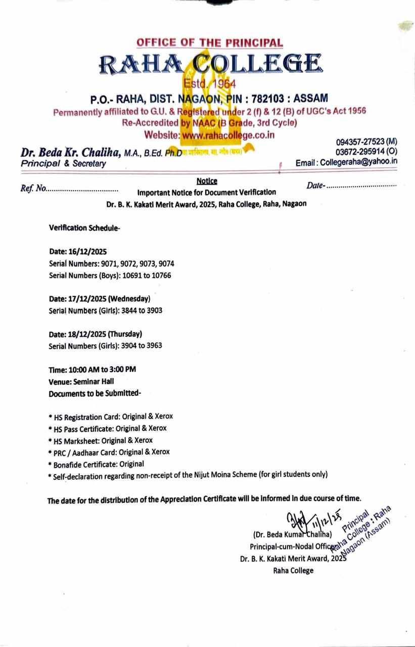 Dr. B.K.Kakati Merit Award 2025 Raha College